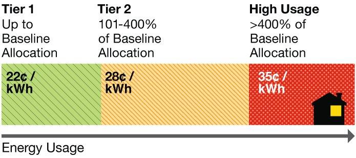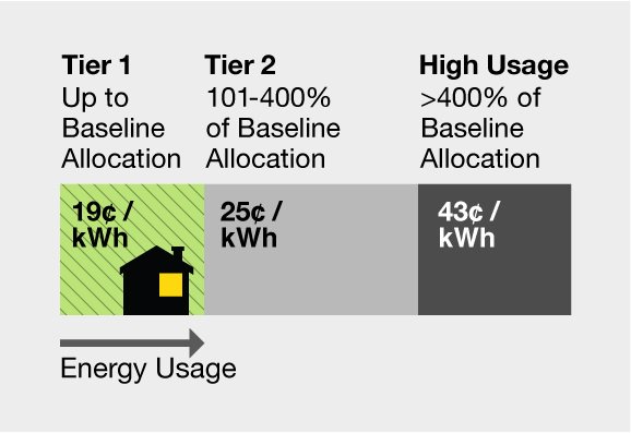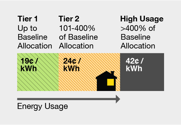 In the Tiered Rate Plan (Schedule D), you begin each billing period at the Tier 1 rate, which has the lowest price per kilowatt-hour (kWh). If you use more energy than the baseline allocation for your region, your rate climbs to Tier 2.